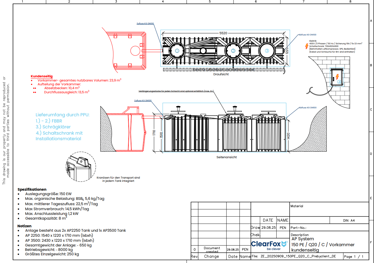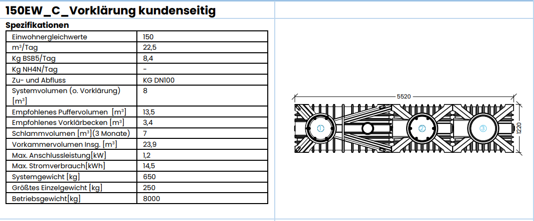 Das Produkt ClearFox® AP FBBR o. Vorklärung (C - 150 EW) ist dafür ausgelegt Kohlenstoff (C = CSB & BSB5) abzubauen. Hierbei ist die Vorklärung kundenseitig zu stellen. Die empfohlene Puffergröße ist unten in der Tabelle angegegeben.
