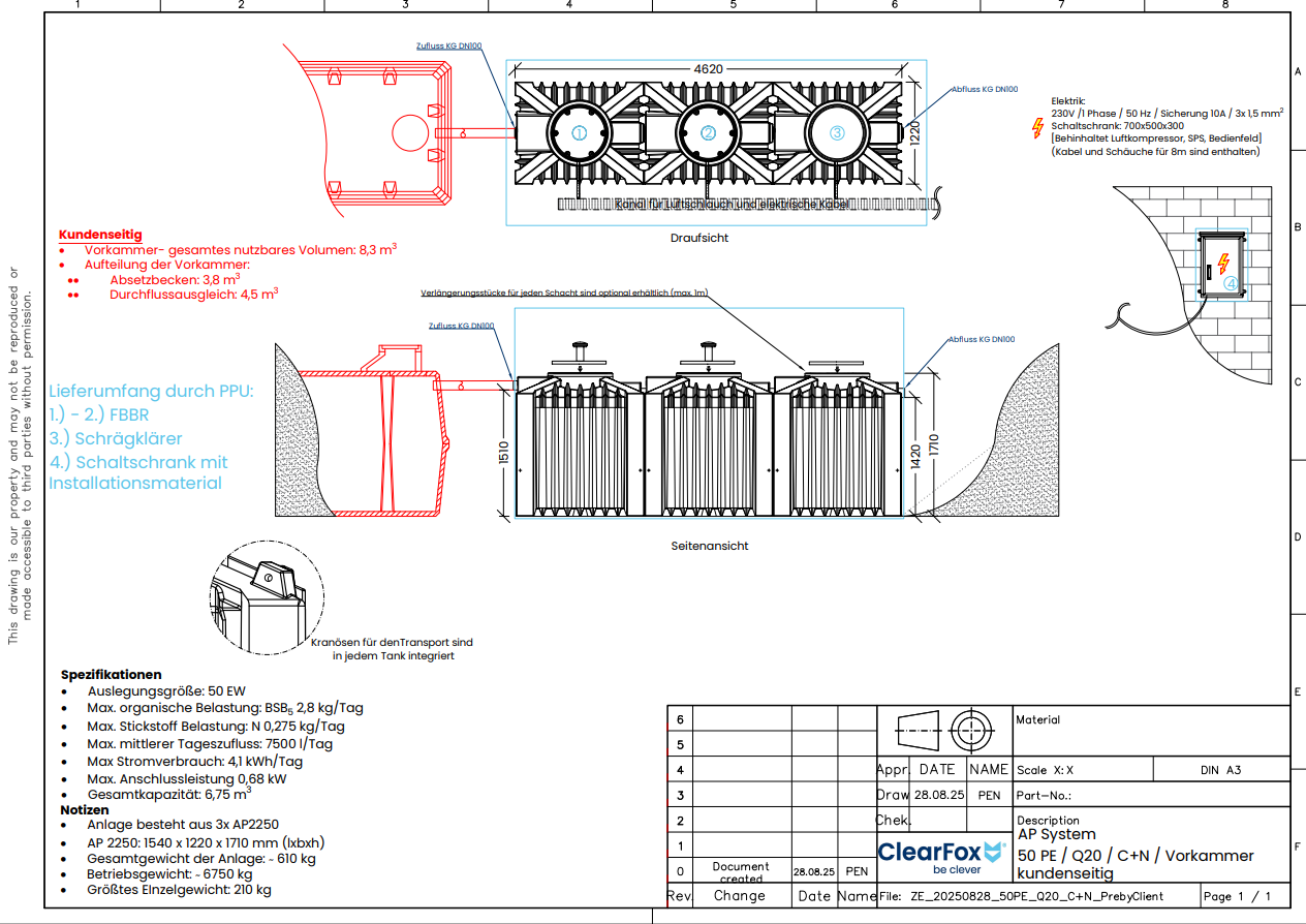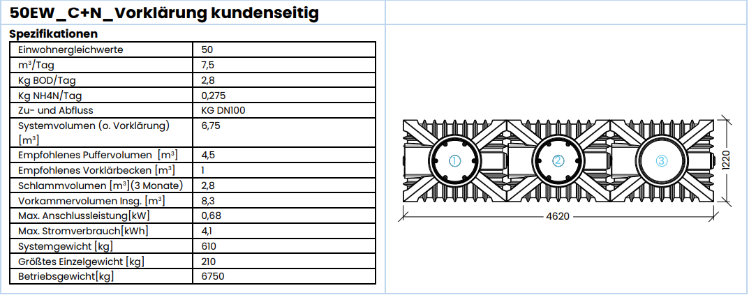 Das Produkt ClearFox® AP FBBR o. Vorklärung (C+N - 50 EW) ist dafür ausgelegt Kohlenstoff (C = CSB & BSB5) abzubauen. Hierbei ist die Vorklärung kundenseitig zu stellen. Die empfohlene Puffergröße ist unten in der Tabelle angegegeben.